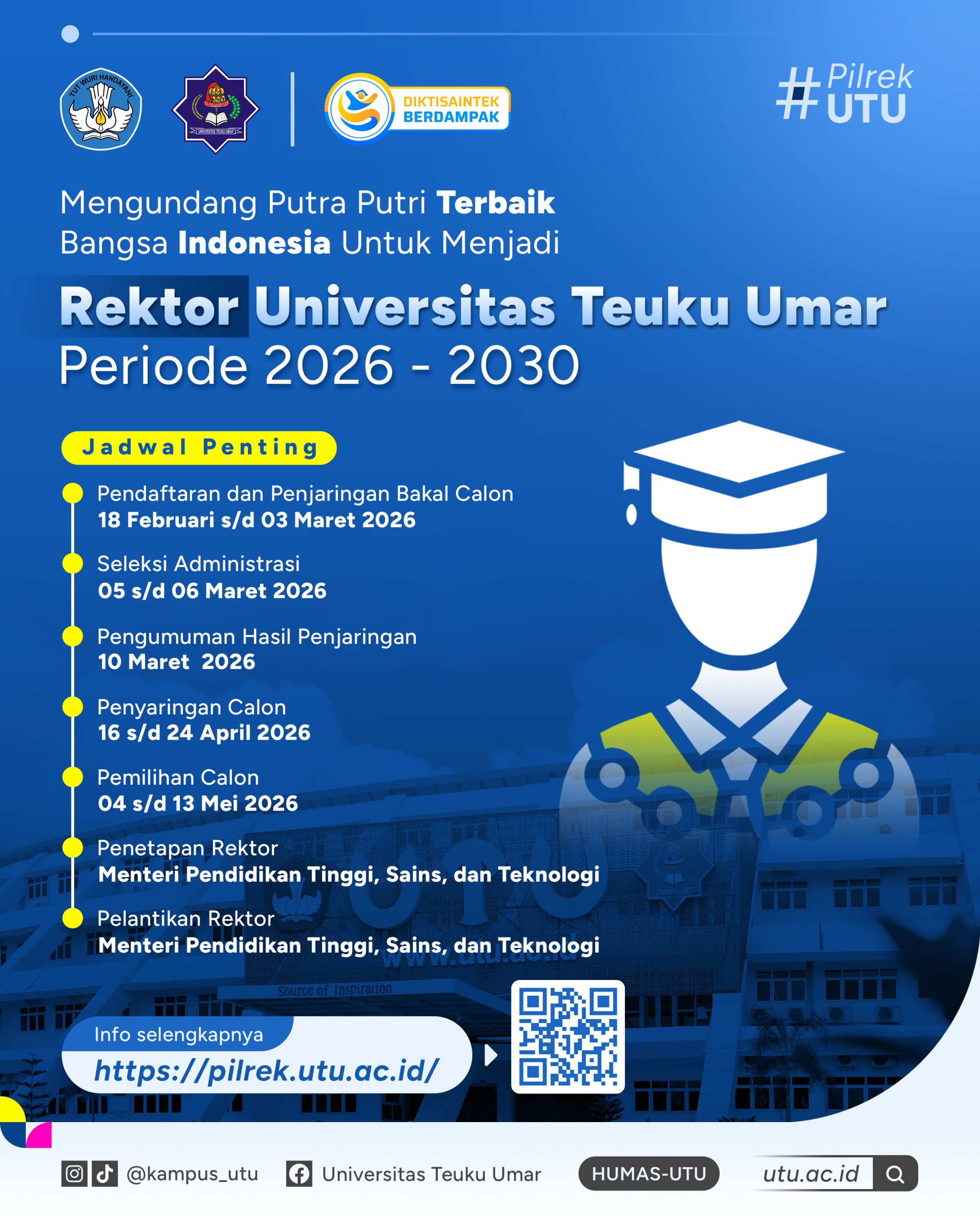| Penetapan dan Pelantikan calon Rektor terpilih sebagai Rektor Universitas Teuku Umar periode Tahun 2026-2030 oleh Menteri Kementerian Pendidikan Tinggi, Sains, dan Teknologi. | – menyesuaikan jadwal Menteri | |